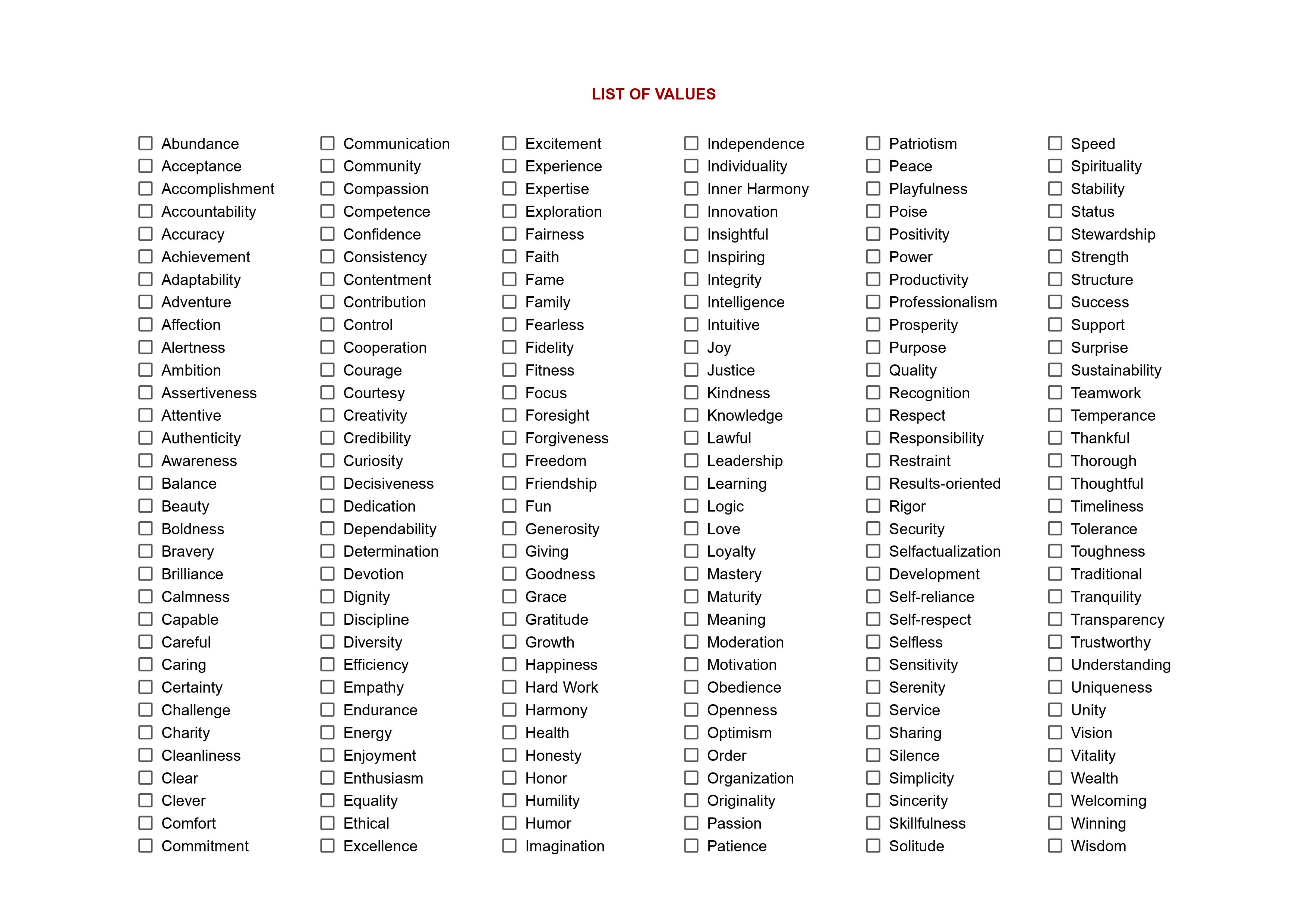 Quite simple in its idea, the Big Value List is an exercise, where you confront yourself with a multitude of values. Based on your intuition, choose the values which resonate the most with you. Are there some which you do not agree with? Also mark your anti-values